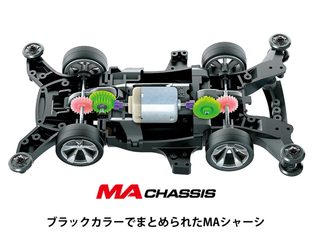 MAシャーシ:ダブルシャフトモーターによるダイレクトドライブで重心の低さに加えて気流が意識されたシャーシデザインです。6個のローラーが標準装備され、サイドの拡張性もアップしたハイパフォーマンスシャーシです。