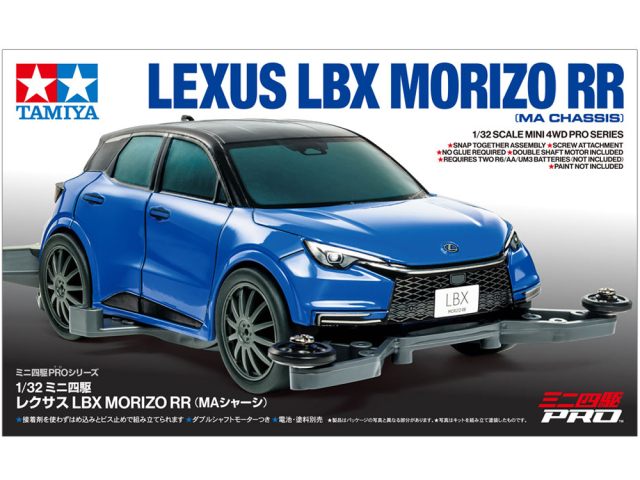 【ミニ四駆で楽しむ、LBXの走り】高性能な走りでレースも楽しい四輪駆動レーサーのプラスチックモデル組み立てキットです。レクサスのコンパクトクロス「LBX」の走行性能を高めて、スポーティな走りや運転の楽しさを追求したハイパフォーマンスモデル、LBX MORIZO RRのミニ四駆です。上質で存在感のあるダイナミックなスタイルを実車の雰囲気豊かに再現され、ブラックアウトされたルーフをはじめ、前後のライト類や「ユニファイドスピンドルグリル」と呼ばれる特徴的なフロントグリルはステッカーとなっています。また、駆動効率に優れるダブルシャフトモーターを搭載し、エアロダイナミクスにもこだわった高性能・組み立て簡単なMAシャーシです。MORIZO RRの迫力あふれる走りもそのままにスケールダウンされた注目のマシンです。